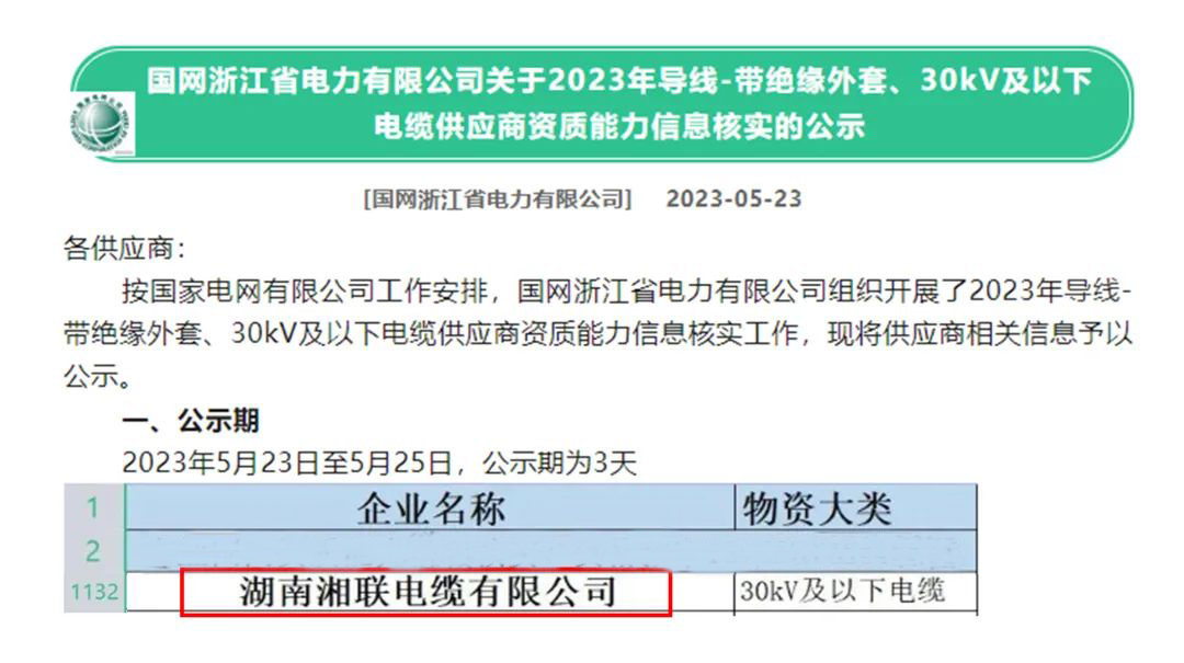 5月,憑借出色的產(chǎn)品品質(zhì)、優(yōu)質(zhì)的服務(wù)和良好的聲譽,湘聯(lián)電纜通過了審查,成為2023年國網(wǎng)供應(yīng)商。
