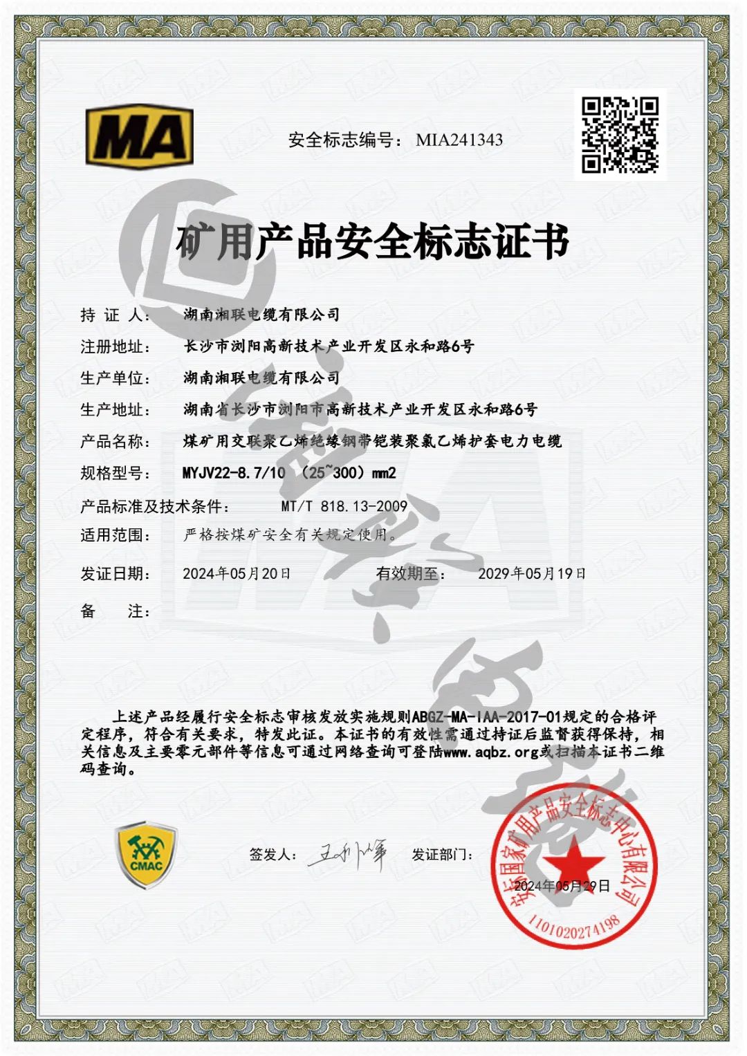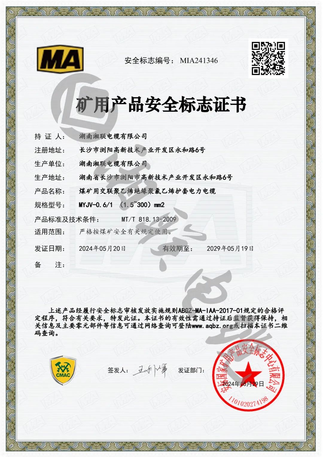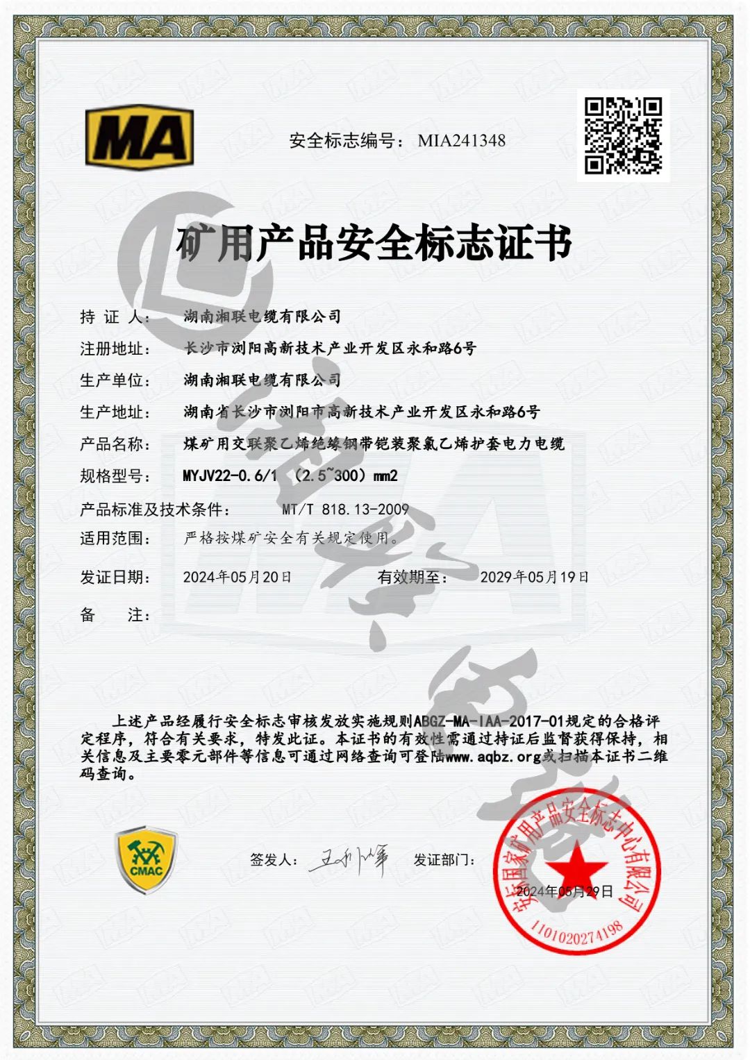 近日,湖南湘聯(lián)電纜有限公司成功取得安標(biāo)國(guó)家礦用產(chǎn)品安全標(biāo)志中心頒發(fā)MVV-0.6/1(1.5~300)mm2煤礦用聚氯乙烯絕緣聚氯乙烯護(hù)套電力電纜、MYJV-8.7/10(25~300)mm2煤礦用交聯(lián)聚乙烯絕緣聚氯乙烯護(hù)套電力電纜等六個(gè)產(chǎn)品的礦用產(chǎn)品安全標(biāo)志證書。